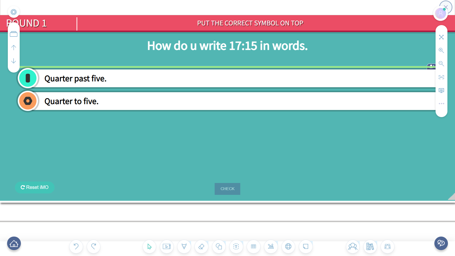 De volgende app is een multiple choice vraag waarbij de leerlingen het juiste antwoord moeten aanduiden. Als ze een antwoord hebben geselecteerd moeten zen onder op de knop 'checken' klikken om hun antwoord na te kijken.