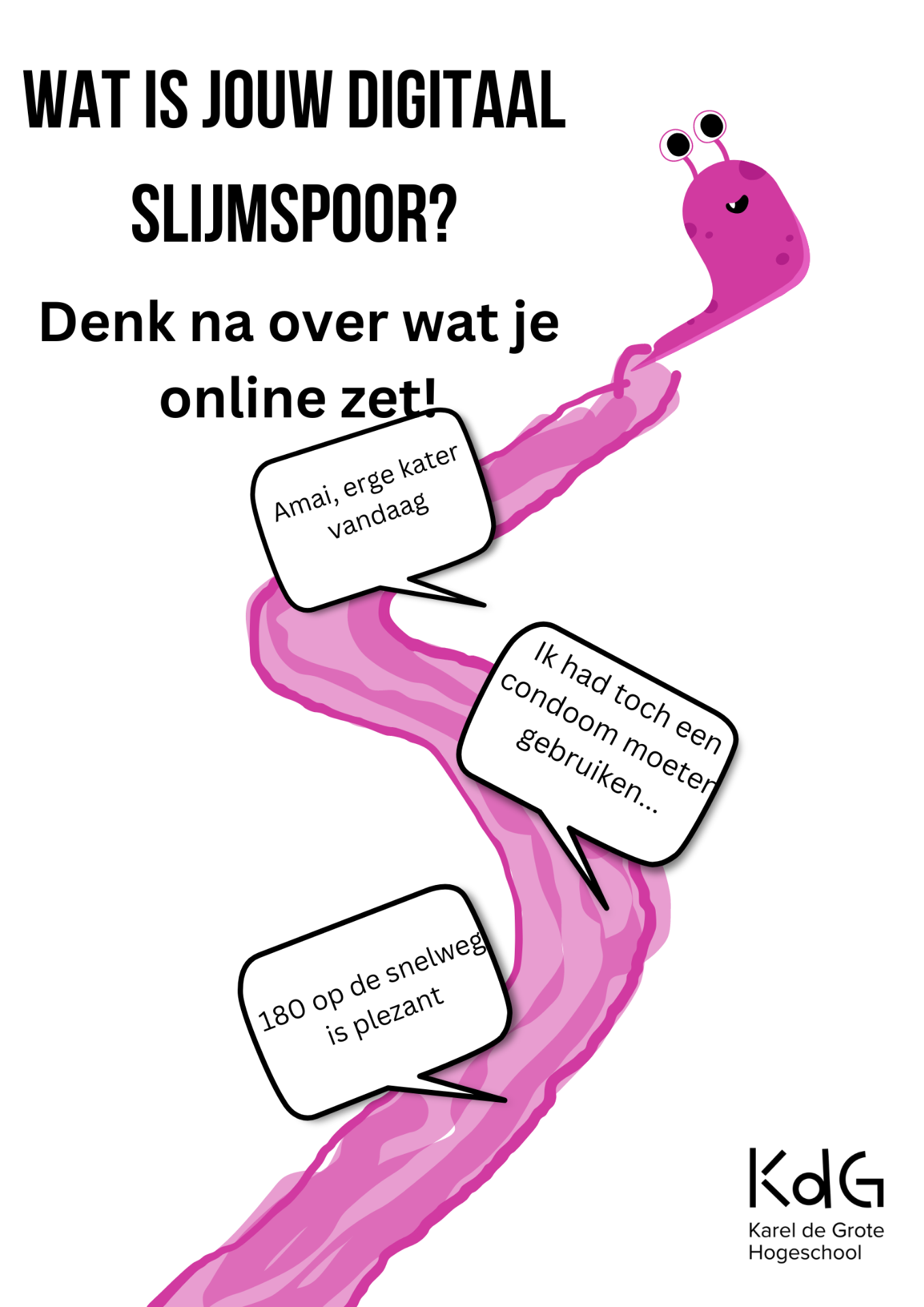De beoogde doelgroep is de eerste graad. Er staan enkele voorbeelden van posts/ comments die je best niet online kan plaatsen. De titel is een mengeling van het onderwerp van de poster, je digitale spoor, en het thema, een slak met slijm. De tip staat net onder de titel.